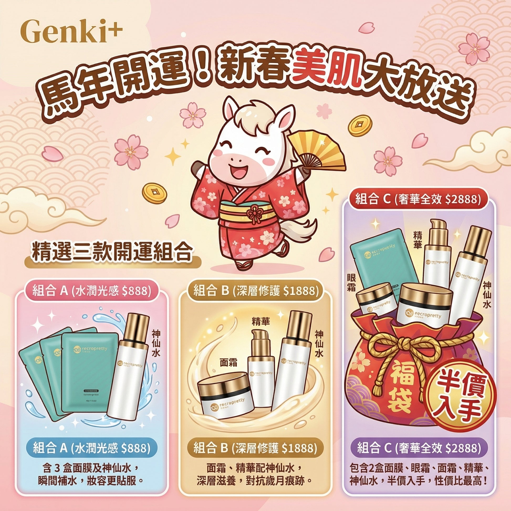 新一年,讓肌膚以最佳狀態「馬」上變靚!Genki+ 誠意獻上 2026 限定 【迎馬新春優惠組合】,集合美白淡斑、緊緻提升及撫平毛孔的皇牌產品,為您急救疲倦肌膚,重塑輪廓。
